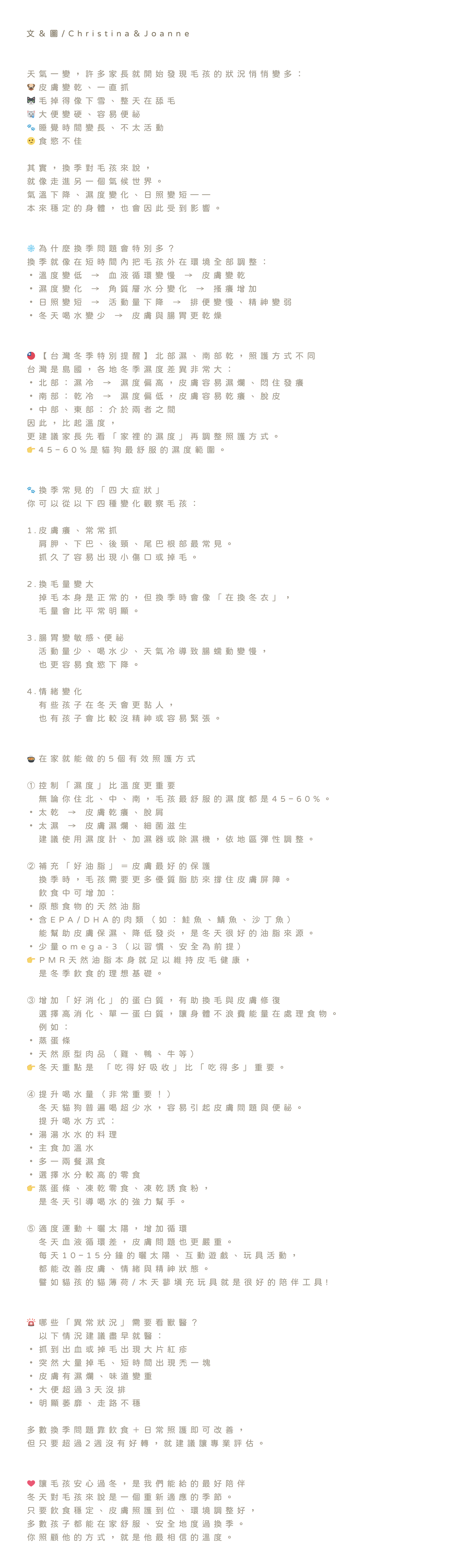 簡介:許多家長會發現毛孩的身體因換季起了變化:皮膚變乾;毛掉得像下雪;便祕;活動量下降、整天窩著睡。其實,換季對毛孩來說就像走進另一個氣候世界——溫度驟降、濕度大幅改變、日照變短,會讓身體需要重新調整。而台灣的冬天更特別:北部濕冷、南部乾冷,不同地區的毛孩因為濕度差異,皮膚與腸胃承受的負擔也不同。比起溫度,更讓環境濕度維持在 45–60%,再透過良好油脂、易消化蛋白質、足夠水分與適度日曬,能大幅改善換季不適。掌握孩身體的「季節開關」,冬天也能過得舒服又安心。